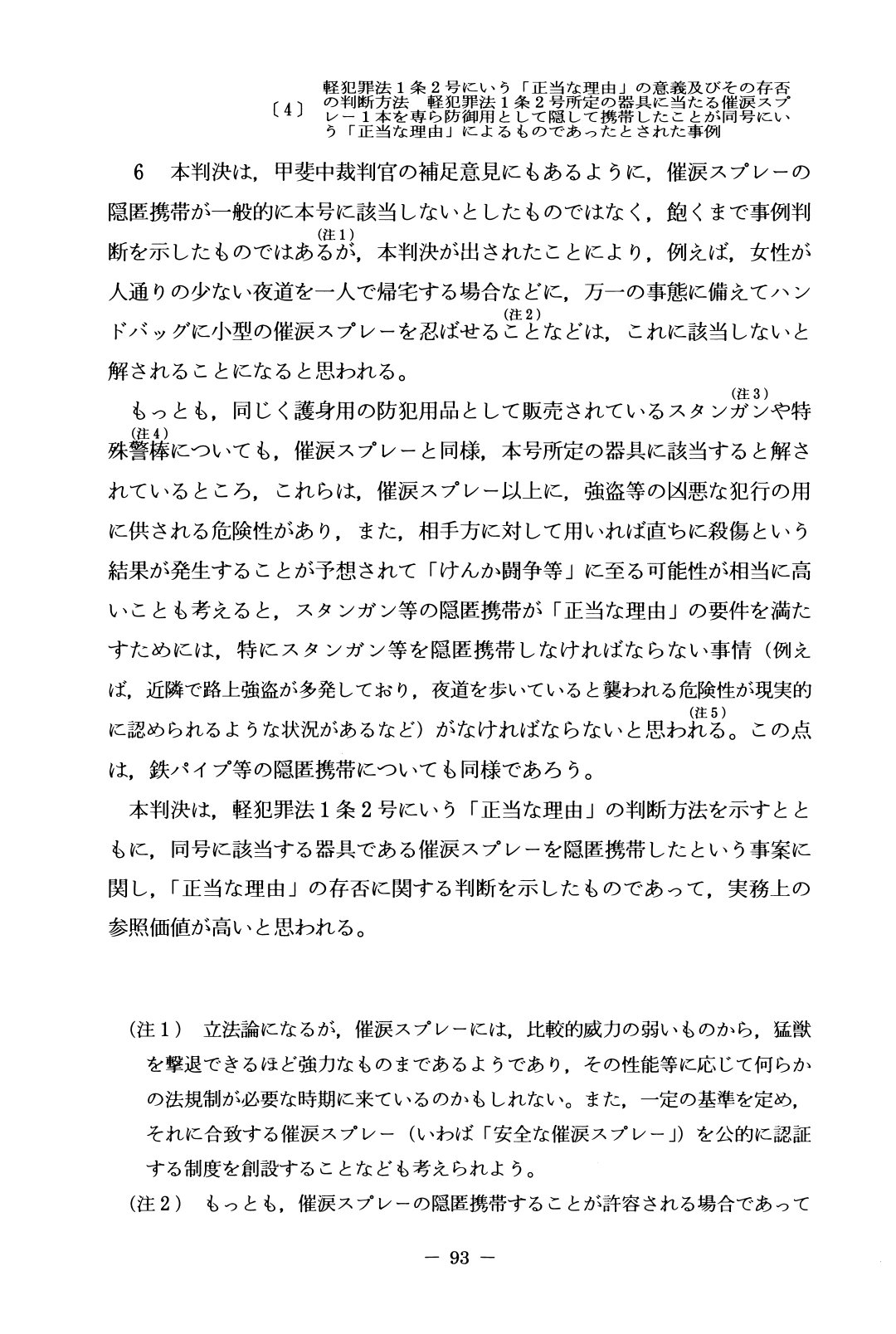 女性は、一般的にいって男性に比べて身体的暴力に脆弱です。そのため、夜道などで襲われた際の自衛策として反撃手段を持ちたいというのは当然のことです。最判平成21年3月26日は催涙スプレーを護身用に所持していた事案で、「正当な理由」があるとして軽犯罪法違反の成立を否定しました。最高裁判例の担当調査官の解説では女性が護身用に催涙スプレーを持ち歩くことについて肯定的な見解も示されています。軽犯罪法違反については、現場での注意、始末書処分、立件、と段階を踏んでの取り締まりがなされていますので、実務的には、立件すらされないと考えます。